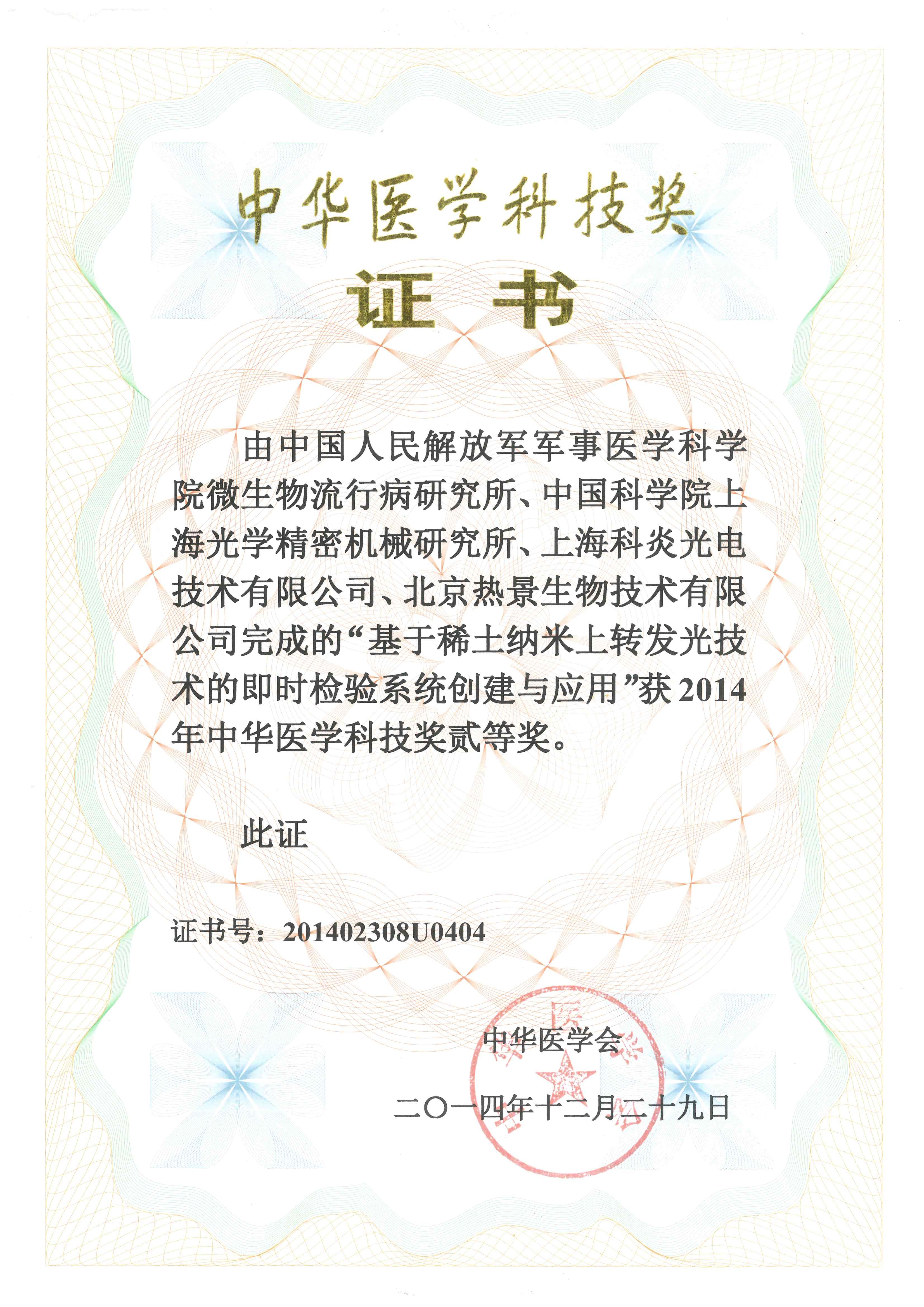 由北京熱景生物技術(shù)有限公司參與完成的“基于稀土納米上轉(zhuǎn)發(fā)光技術(shù)的即時檢驗系統(tǒng)創(chuàng)新與應用”榮獲2014年中華醫(yī)學科技獎貳等獎。