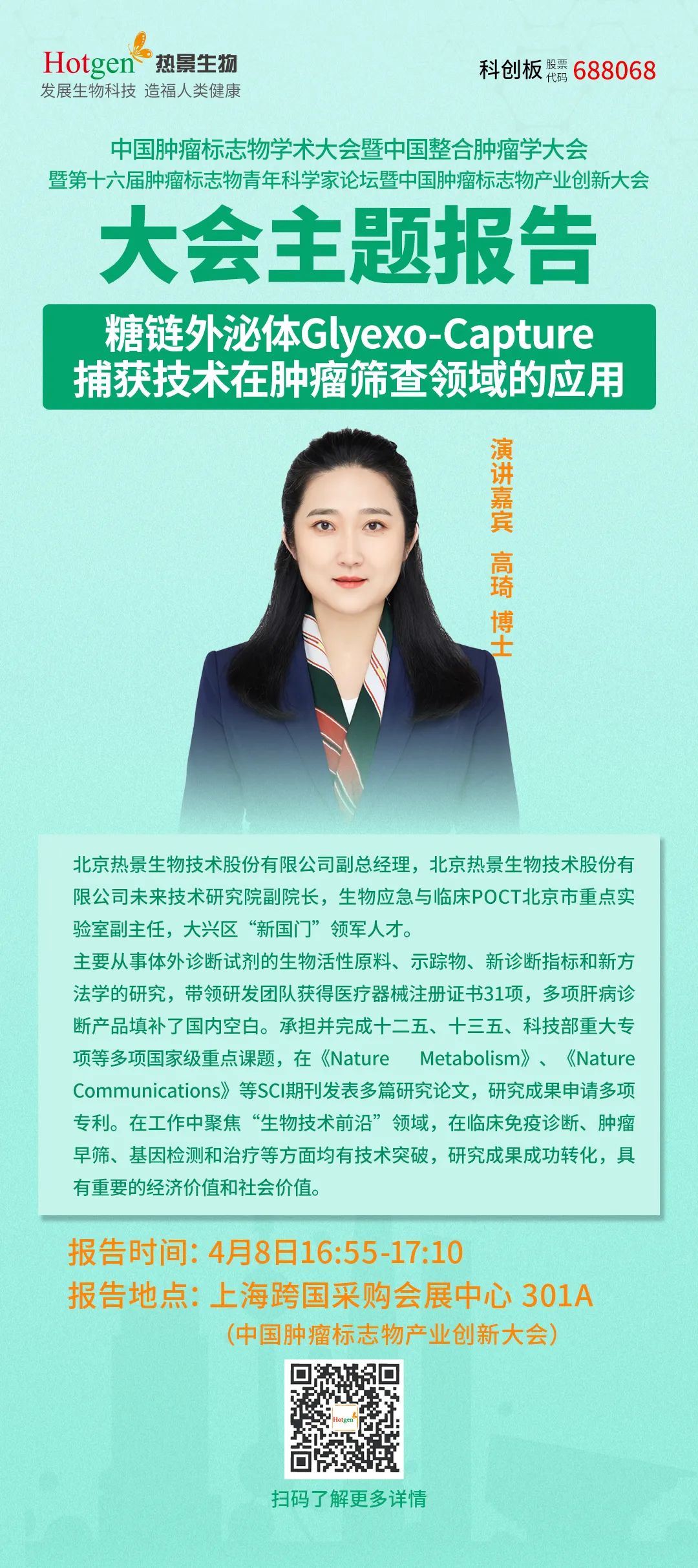 4月8日下午,北京熱景生物技術(shù)股份有限公司副總經(jīng)理,北京熱景生物未來(lái)技術(shù)研究院副院長(zhǎng)高琦博士受邀在中國(guó)腫瘤標(biāo)志物產(chǎn)業(yè)創(chuàng)新大會(huì)分享創(chuàng)新技術(shù)報(bào)告《糖鏈外泌體Glyexo-Capture捕獲技術(shù)在腫瘤篩查領(lǐng)域的應(yīng)用》。
