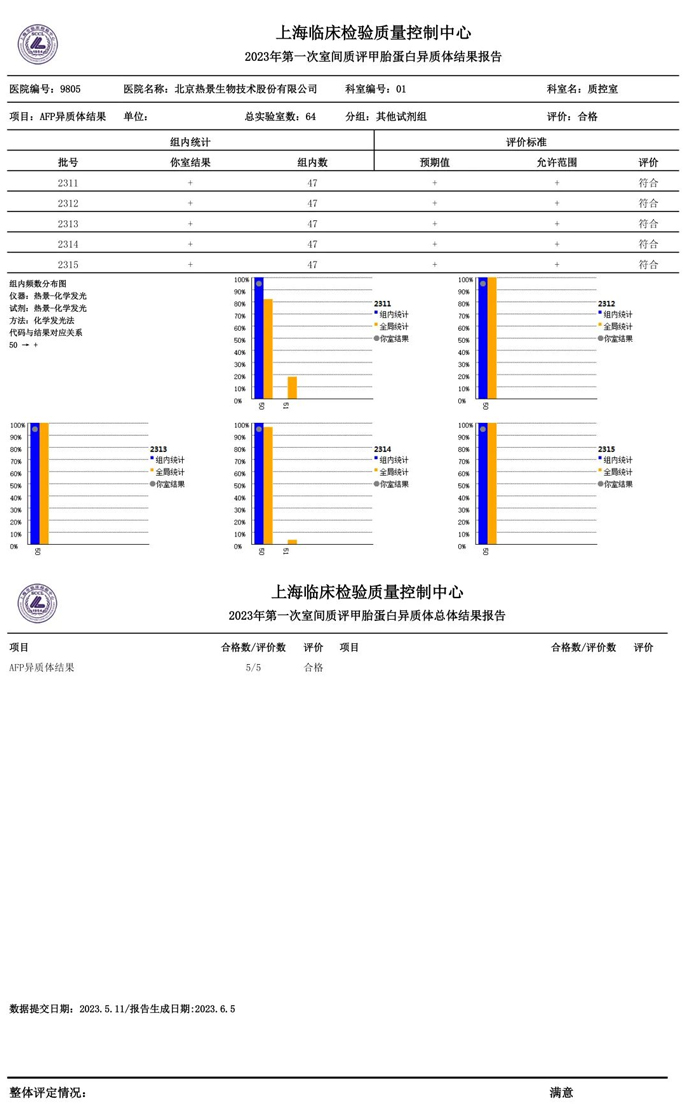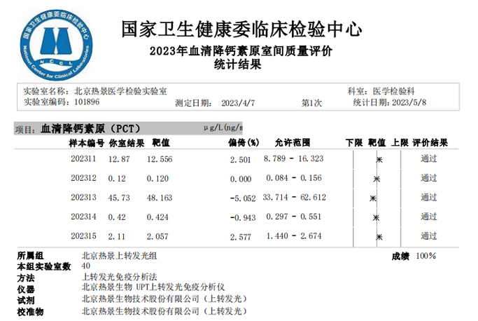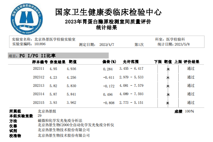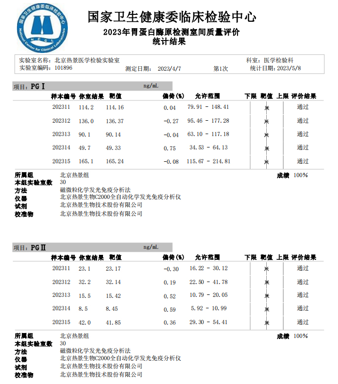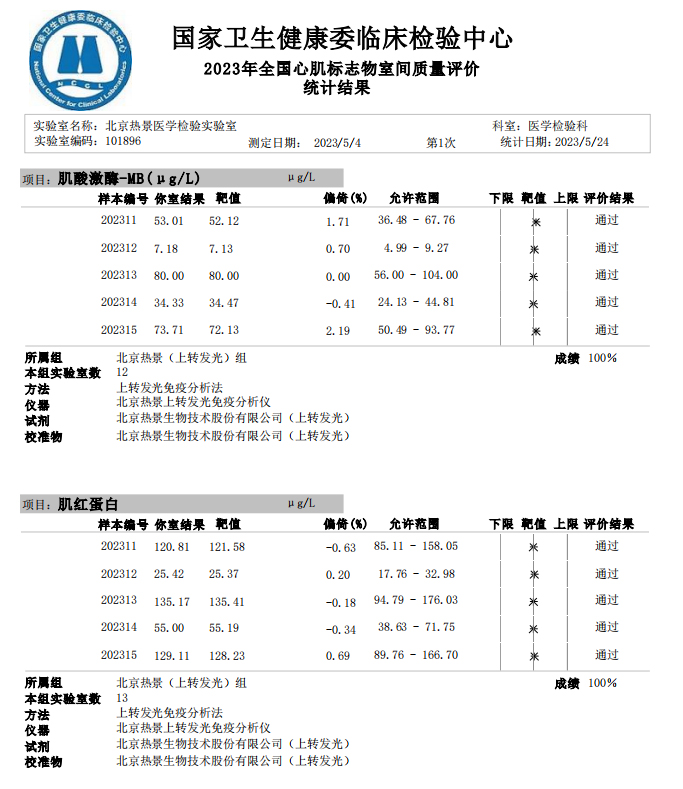 近日,國家衛(wèi)生健康委臨床檢驗中心(NCCL)公布了2023年多項全國臨床檢驗室間質(zhì)量評價結(jié)果。熱景生物旗下熱景醫(yī)學檢驗實驗室以100分的優(yōu)異成績通過“胃蛋白酶原”“血清降鈣素原”“N末端前腦鈉肽”“心肌標志物”等室間質(zhì)評項目。同時,熱景生物參與的上海市臨床檢驗中心2023年第一次能力驗證項目,包括B型鈉尿肽/N端-B型鈉尿肽前體、AFP異質(zhì)體比率、肌鈣蛋白I、降鈣素原等項目均通過驗證,充分彰顯了熱景生物穩(wěn)定可靠的實驗室質(zhì)量管理和檢測能力,以及強大的產(chǎn)品和技術(shù)實力!
