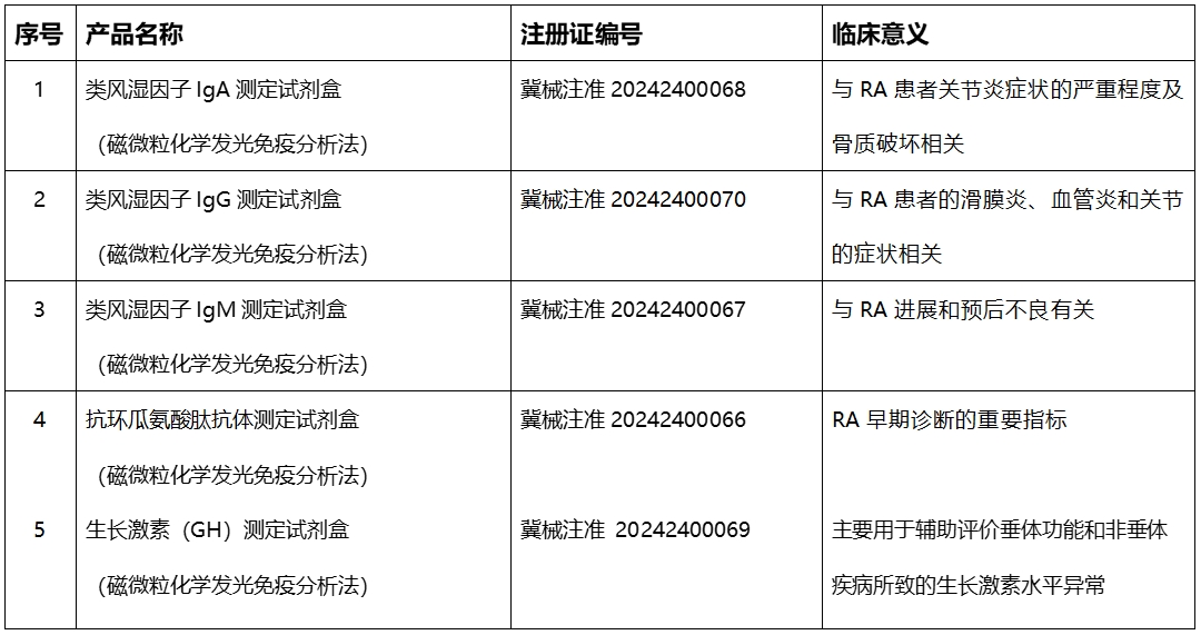 近日,熱景生物新取得由河北省藥品監(jiān)督管理局頒發(fā)的醫(yī)療器械注冊證,分別是類風濕因子分型(RF-IgA、RF-IgG、RF-IgM)、CCP抗體、生長激素(GH)、胰島素樣生長因子結(jié)合蛋白-3(IGFBP-3),見下表:
