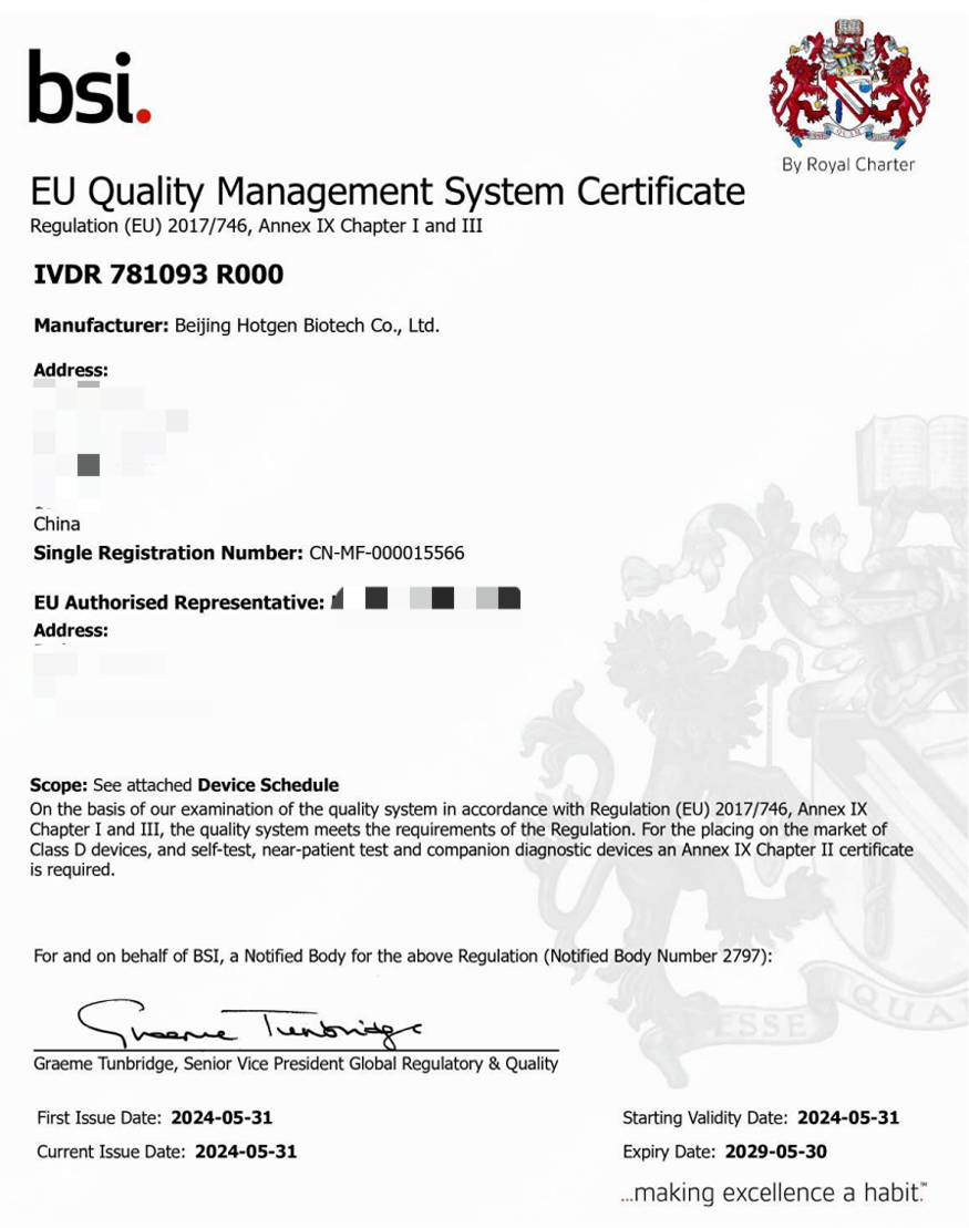 The Regulation (EU) 2017/746 on in vitro diagnostic Medical Devices is the new EU legislation for in-vitro diagnostic (IVD) medical devices. On May 26th, 2022, the Regulation (EU) 2017/746 (IVDR) fully applies across the European Union region. The 14 newly certified products are evidences of Hotgen’s unwavering commitment to safety, quality, and effectiveness of diagnostic products, as well as loyalty to the demand of healthcare professionals and patients.