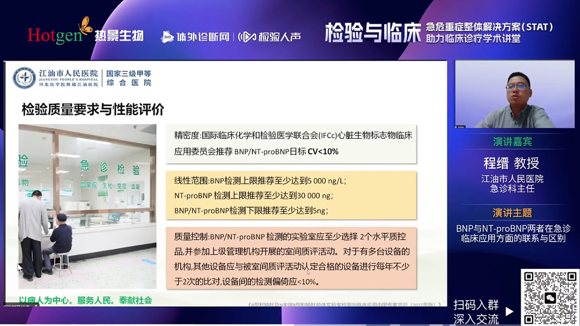 四川省江油市人民醫(yī)院急診科程縉教授就BNP與NT-proBNP兩個指標進行了深入剖析,從BNP與NT-proBNP病理生理機制出發(fā),解析了BNP和NT-proBNP之間的區(qū)別,全面的闡述了影響B(tài)NP和NT-proBNP水平的因素,又從檢驗角度強調(diào)BNP/NT-proBNP質(zhì)量要求和性能評價。最后程教授回歸臨床分享BNP/NT-proBNP在心衰早期篩查與一級預(yù)防、心衰的診斷與鑒別診斷和心衰治療監(jiān)測和預(yù)后評估等臨床價值。