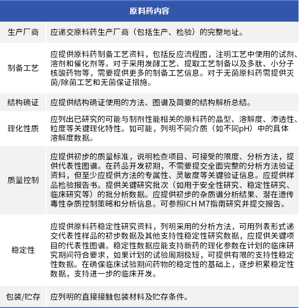 由于小核酸藥物的制備,通常使用固相合成技術(shù),故工藝開發(fā)、工藝放大和質(zhì)量控制上存在一定的壁壘,對技術(shù)、設(shè)備、環(huán)境有較高的要求,伴隨著的也是高成本,國內(nèi)對于這方面的硬件條件配套,還有很大的發(fā)展空間。早期的注冊申報(bào),如果按照《新藥I期臨床試驗(yàn)申請技術(shù)指南》進(jìn)行工作開展,原料藥和制劑需要按照以下內(nèi)容進(jìn)行。