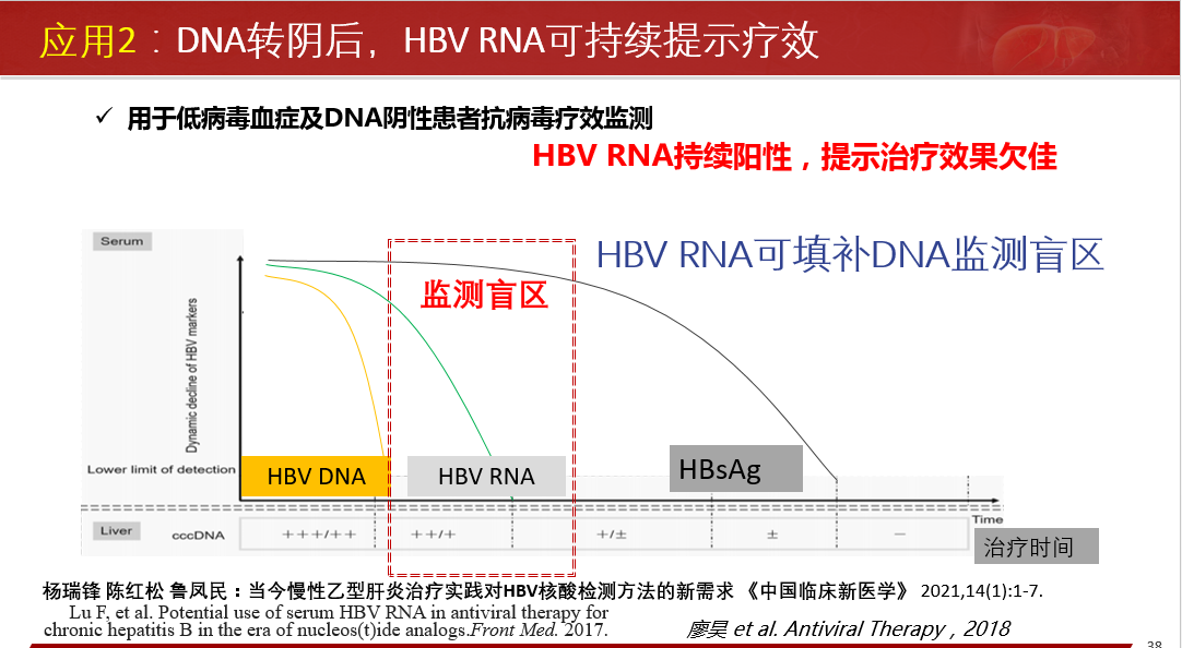 ★ 用于低病毒血癥及DNA陰性患者抗病毒療效監(jiān)測(cè);HBV RNA可填補(bǔ)HBV DNA監(jiān)測(cè)盲區(qū),HBV DNA轉(zhuǎn)陰后可持續(xù)提示療效,HBV RNA持續(xù)陽(yáng)性,提示治療效果欠佳。