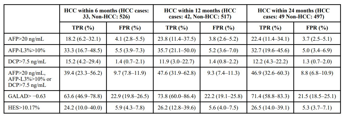 · 6個月、12個月和24個月內(nèi),三種生物標志物在所有階段的肝癌和早期肝癌的真陽性率(TPR)均逐漸增加,假陽性率(FPR)則逐漸下降。