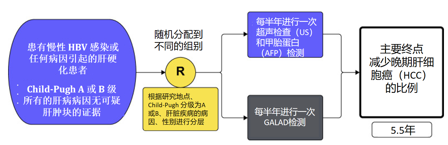 為了驗(yàn)證GALAD模型在真實(shí)世界中的臨床應(yīng)用效果,美國(guó)國(guó)家癌癥研究所(NCI)牽頭開展了TRACER試驗(yàn)。TRACER 研究是一項(xiàng)實(shí)用的隨機(jī) IV 期試驗(yàn),旨在比較基于超聲的篩查與生物標(biāo)志物組合 GALAD 在患有慢性 HBV 感染或任何病因引起的肝硬化患者中的應(yīng)用。簡(jiǎn)而言之,5500 名患者以 1:1 的方式隨機(jī)分配到 A 組,建議每半年進(jìn)行一次超聲 ± AFP 篩查,或 B 組,建議每半年進(jìn)行一次 GALAD 篩查。按地點(diǎn)、Child-Pugh 分級(jí)(A 與 B)、肝病病因(病毒性、非病毒性和非肝硬化性 HBV 感染)和性別進(jìn)行隨機(jī)分層。通過對(duì)比兩組的結(jié)果,研究人員希望能夠確定哪種方法能更好地減少晚期肝癌的發(fā)現(xiàn)率,并改善患者的治療效果。