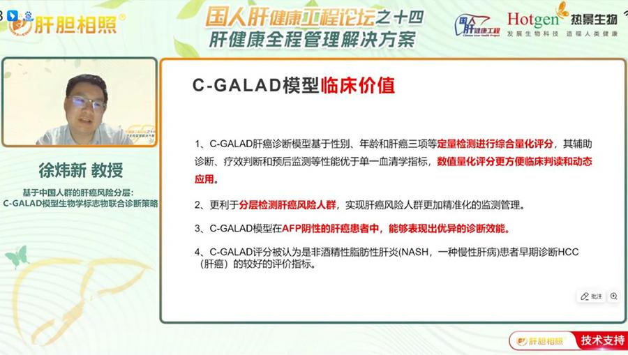 上海交通大學(xué)醫(yī)學(xué)院附屬仁濟醫(yī)院嘉定分院檢驗科的徐煒新教授圍繞肝癌早篩技術(shù)革新發(fā)表主題報告,他深入解析C-GALAD模型的臨床價值與應(yīng)用前景,為肝癌防控提供新策略。現(xiàn)狀與突破----我國肝癌早期診斷率低,傳統(tǒng)超聲聯(lián)合AFP檢測對早期小肝癌敏感性不足?;凇逗D鲜≡缙诟伟┖Y查實施方案》將“肝癌三項”(AFP、AFP-L3%、異常凝血酶原)納入常規(guī)篩查,徐主任指出,多標志物聯(lián)合檢測成為破局關(guān)鍵:AFP-L3%提升惡性鑒別特異性,異常凝血酶原(DCP)反映腫瘤侵襲性,三者互補顯著提高早診效能。 C-GALAD模型:本土化創(chuàng)新典范----針對中國80%以上肝癌由乙肝驅(qū)動的人群特征,熱景生物研發(fā)的C-GALAD模型,整合年齡、性別與“肝癌三項”定量數(shù)據(jù),通過算法生成風(fēng)險評分,實現(xiàn)三大優(yōu)勢:①精準分層:量化評分指導(dǎo)高危人群分級管理(如肝硬化患者每6個月聯(lián)合超聲篩查);②動態(tài)監(jiān)測:評分變化早于影像學(xué)提示復(fù)發(fā)風(fēng)險,助力療效評估;③指南推薦:獲《原發(fā)性肝癌診療指南(2024年版)》認可,成為輔助診斷核心工具。臨床與政策協(xié)同---國內(nèi)外指南均強調(diào)風(fēng)險分層管理。徐主任呼吁推動“C-GALAD+超聲”聯(lián)合篩查普及,并展望未來融合液體活檢、AI影像技術(shù),構(gòu)建普惠化早篩體系。