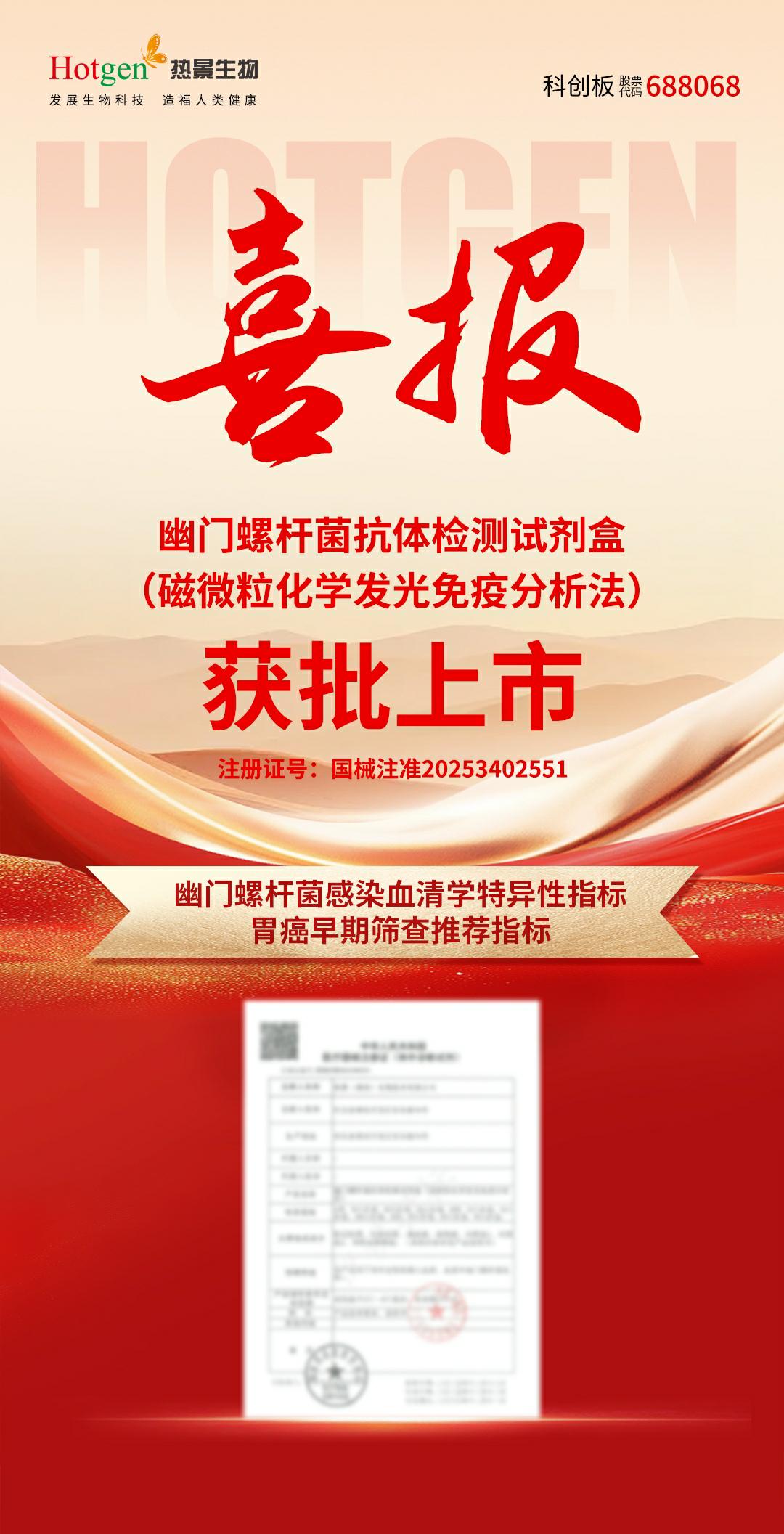 近期,北京熱景生物憑借深厚的研發(fā)積淀與技術(shù)創(chuàng)新實力,成功斬獲一項新的醫(yī)療器械注冊證——幽門螺桿菌抗體檢測試劑盒(磁微?;瘜W(xué)發(fā)光免疫分析法)正式通過國家藥品監(jiān)督管理局批準!這是繼胃蛋白酶原Ⅰ(PGⅠ)、胃蛋白酶原Ⅱ(PG Ⅱ)和胃泌素17(G17)后的第四個胃功能檢測項目,豐富了熱景生物在胃病管理領(lǐng)域的產(chǎn)品矩陣,為臨床診療提供更精準的解決方案,為胃癌早期篩查提供更全的有效依據(jù)。